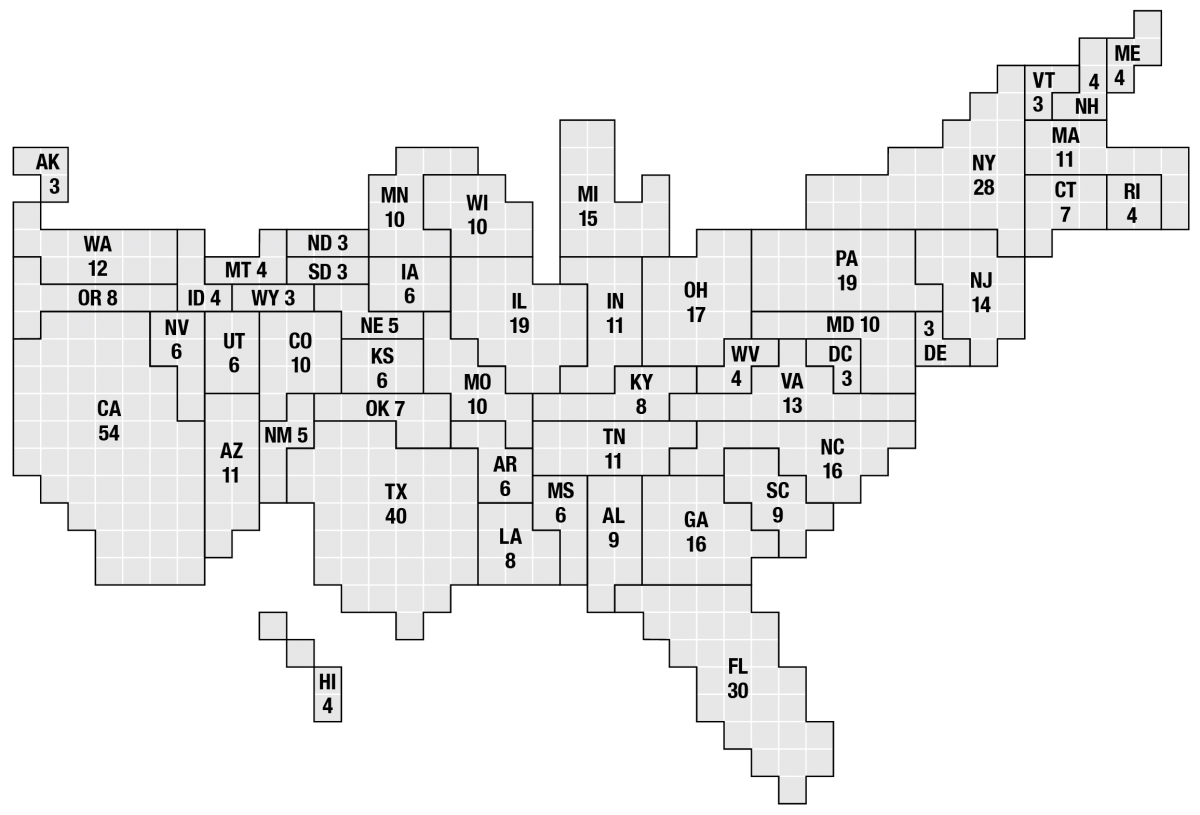 Every 10 years, the 435 U.S. Representatives are reapportioned among the states in accordance with the latest federal census, thereby automatically reapportioning the membership of the Electoral College among the states. The map below shows the number of electoral votes for each state, according to the 2020 census.