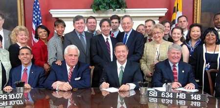 Maryland Governor O'Malley signs National Popular Vote bill. Sitting (from left): Lt. Gov. Anthony Brown, Senate President Mike Miller, Gov. Martin O'Malley, and Speaker Mike Busch. Standing (from left): Delegates Barbara Frush; Senators Verna Jones, Catherine Pugh, Roy Dyson, Chris Falkenhagen, and Jamie Raskin (main sponsor of SB 634 and now a Member of Congress); Ryan O'Donnell (Fair Vote Action Maryland), former U.S. Senator Birch Bayh of Indiana; Hannah Powers; Delegates Jon Cardin and Sheila Hixson (main sponsor of HB 148); Raskin aides Carol McDermott and Alice Wilkerson; Delegates Jim Gilchrist, Susan Lee, Veronica Turner, and Keith Haynes.