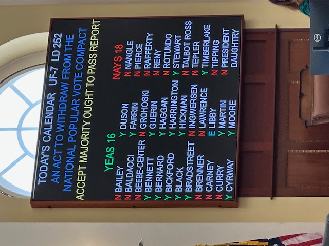 On June 16, 2025, the Maine Senate voted 18-16 against repealing the National Popular Vote law (status of LD252). In the picture of the Senate roll call vote on June 16, a NAY vote was a vote against repeal, and a YEA vote was a vote to repeal. On June 17, both the House and Senate reiterated the positions they previously took -- thus killing the repeal bill.