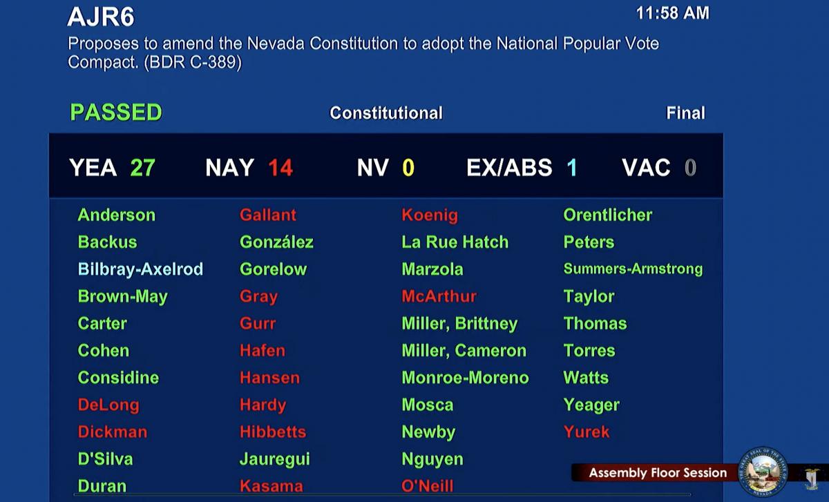 On April 17, 2023, the Nevada Assembly passed the National Popular Vote interstate compact (status of AJR6).